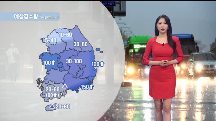 지금 전국 대부분 지역에 세찬 가을비가 쏟아지고 있습니다. 호우특보가 내려진 경기남부와 충청, 전남과 경남, 남부 해안 지역에는 시간당 30~60mm 안팎의 폭우가 내리는 곳이 있는데요. 내일 아침까지 영동과 충청, 남부를 중심으로 돌풍과 벼락을 동반한 강한 비가 집중되겠습니다. 경기남부와 충남, 전라해안에는 오늘 밤까지, 영동과 충북, 영남과 제주에는 내일 아침까지 시간당 30~50mm의 집중호우가 내리겠습니다. 비는 내일 오전 중부지방을 시작으로 밤까지 대부분 그칠 텐데요. 수도권에는 5에서 많게는 80mm의 비가 내리겠고요. 가장 많이 내리는 경남남해안에는 최대 150mm가 넘는 물벼락이 쏟아지기도 하겠습니다. 또, 인천과 남부해안, 제주에는 강풍주의보가 내려진 가운데 내일까지 바람이 초속 20m 이상으로 매우 강하게 불겠습니다. 내일 전국 한낮기온 평년 수준을 보이겠습니다. 서울과 대전 24도, 대구 23도 예상되고요. 인천은 24도에 머물겠습니다. 경기북부 의정부 25도, 경기동부 남양주도 25도로 오르겠고요, 경기남부 용인 23도 기록하겠습니다. 대부분 해상에는 풍랑주의보가 내려진 가운데 물결이 최고 4m 이상으로 높게 일겠습니다. 모레부터는 당분간 비 예보 없이 구름만 지나겠습니다. 날씨였습니다.