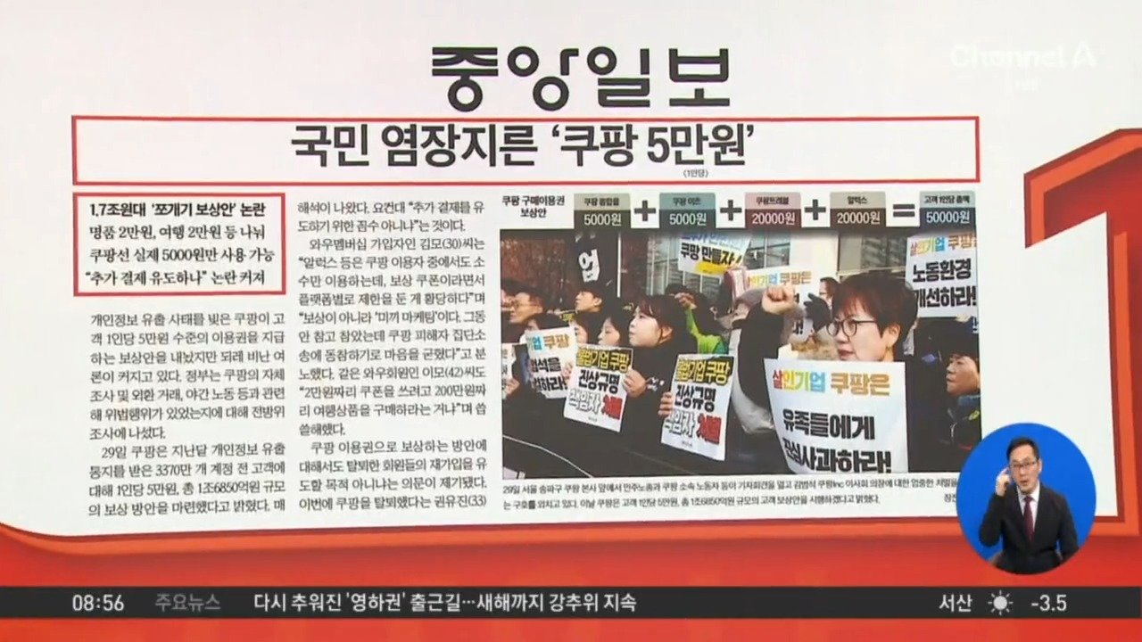 재생 0회 | 등록 2025.12.30<중앙> 국민 염장지른 '쿠팡 5만원' <한국경제> 삼성, 분기 영업익 20兆 … 새 역사 썼다 <동아> "김건희, 역사책에…