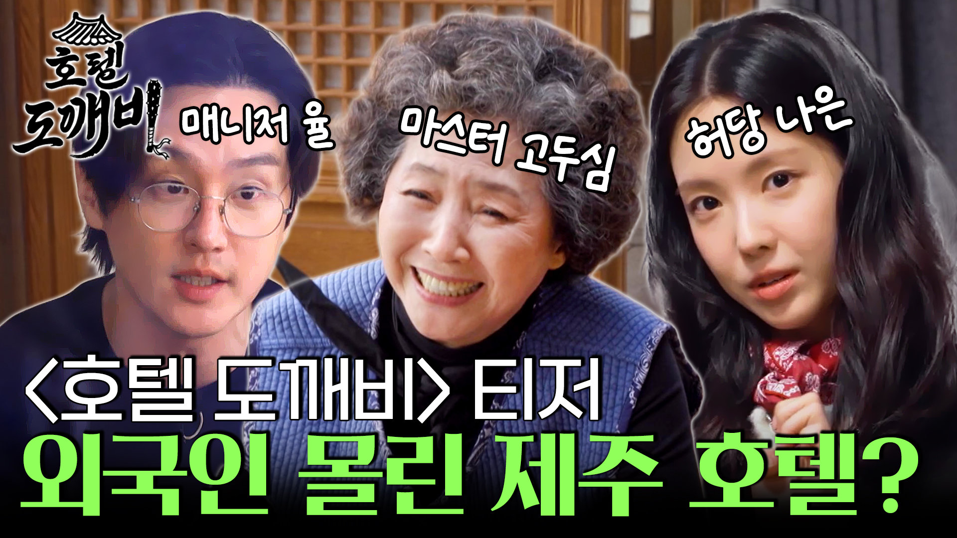 딱! 일주일 동안만 나타났다. 사라지는 신비로운 ‘호텔 도깨비’ 고두심X권율X손나은X김동준X이대휘X전성곤 6인의 도깨비들이 제주도의 전통 한옥 호텔을 운영하며 좌충우돌 글로벌 손님맞이 힐링 리얼리티 프로그램 한옥 호텔 운영의 전반적인 관리! 손님맞이, 숙박, 여행, 먹거리 모두를 책임지는 총괄 지배인 ‘마스터 심이‘ 국민 엄마다운 인자함과 따뜻함으로 손님을 대하면서 호텔 운영에 있어서는 한 치의 오차도 허락하지 않는 무서운 엄마(?) 배우 고두심! 매니저로서 호텔 살림과 청소(?) 담당 깔끔이 ‘율이’ 위로는 마스터 심의를 도와 호텔의 살림을 담당하고 아래로는 의견충돌이 생길 때마다 냉철한 분석력(?)으로 상황을 깔끔하게 정리해 주는 카리스마! 한 톨의 먼지도 용납할 수 없는 깔끔한 성격으로 손님들 숙소의 청소를 책임진 배우 권율! 귀여운 허당의 매력이 철철 넘쳐흐르는 그녀는 유창한 외국어 실력으로 손님들과의 의사소통도 100점 손님들을 위해 특별한 선물(?)까지 준비한 배우 손나은! 각각의 매력을 가진 6인의 도깨비들은 먼 길 찾아온 외국인 손님들과 어떤 케미를 보여줄는지? 감동과 재미 그리고 힐링을 선사할 <호텔 도깨비>2026년 1월 20일 화요일 저녁 8시 30분 #호텔도깨비 #도깨비 #한국 #제주도 #이탈리아 #스위스 #덴마크 #고두심 #권율 #손나은 #김동준 #이대휘 #곤대장 #전성곤 #Korea #외국인 #팝업 #전통 #한옥 #숙소 #숙박 #여행 #한식