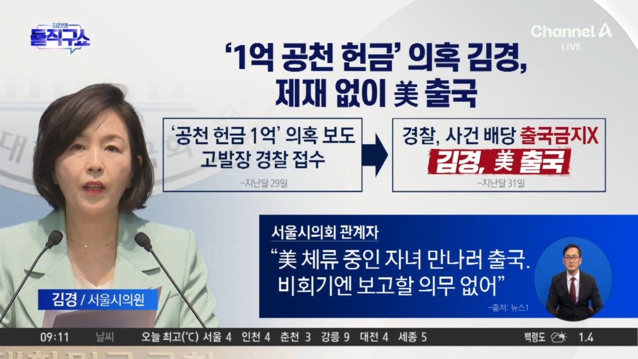 조선 '강선우 1억 의혹' 김경, 이미 美로 떠났다…경찰은 "입국 시 통보" 조선 김경 "美 체류하는 자녀 만나러 가" 고발장 접수 후 수사까지 이틀 걸려 동아 '1억 공천 헌금 의혹' 김경, 고발 이틀 만에 제재 없이 美 출국 Copyright Ⓒ 채널A. All rights reserved. 무단 전재, 재배포 및 AI학습 이용 금지