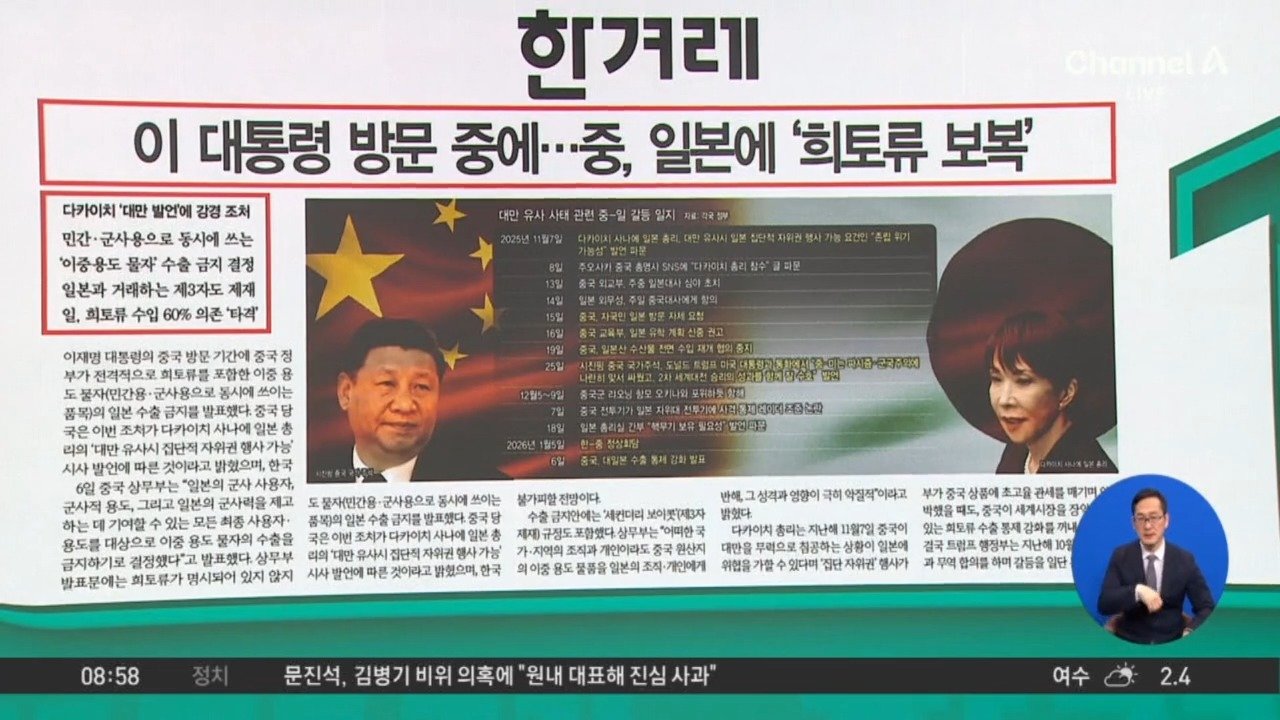 재생 0회 | 등록 2026.01.07<한겨레> 이 대통령 방문 중에…중, 일본에 ‘희토류 보복’ <한국> “의원 갑질, 못 참는다” 여의도 ‘을’의 반격 <동아…