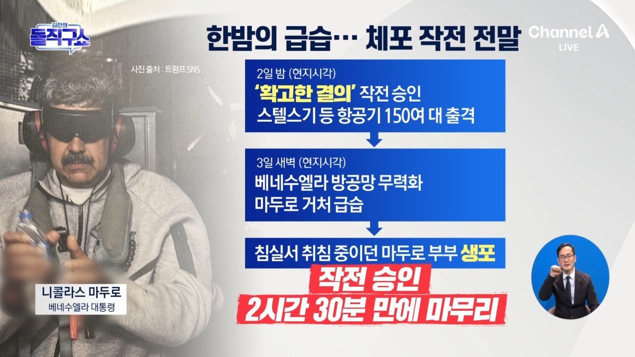 마두로, 한국시간 6일 오전 2시 美 법정 첫 출석 美, 직접 통치 아닌 압박 통한 정책 개입 가닥 美 국무 "베네수 운영, 美 국익 부합하는 정책 개입될 것" Copyright Ⓒ 채널A. All rights reserved. 무단 전재, 재배포 및 AI학습 이용 금지