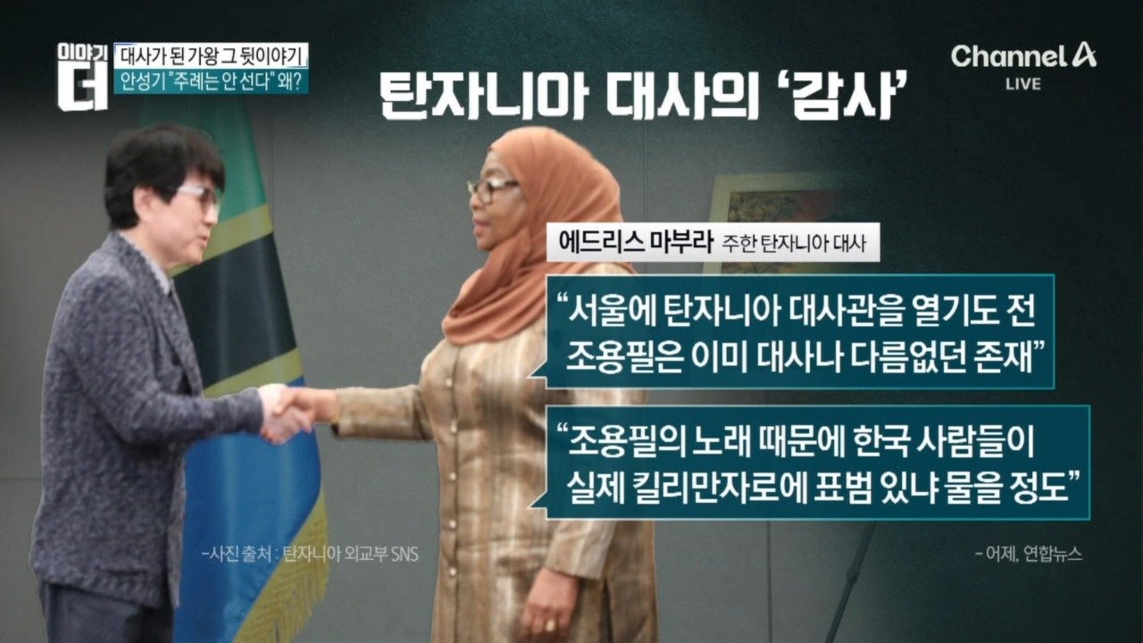 주한 탄자니아 대사 "조용필 우리 대사급 역할" '킬리만자로의 표범' 열창… 이건희 무대 후 '포옹' 안성기 보내며 부른 '친구여'… 조용필의 '추모' Copyright Ⓒ 채널A. All rights reserved. 무단 전재, 재배포 및 AI학습 이용 금지
