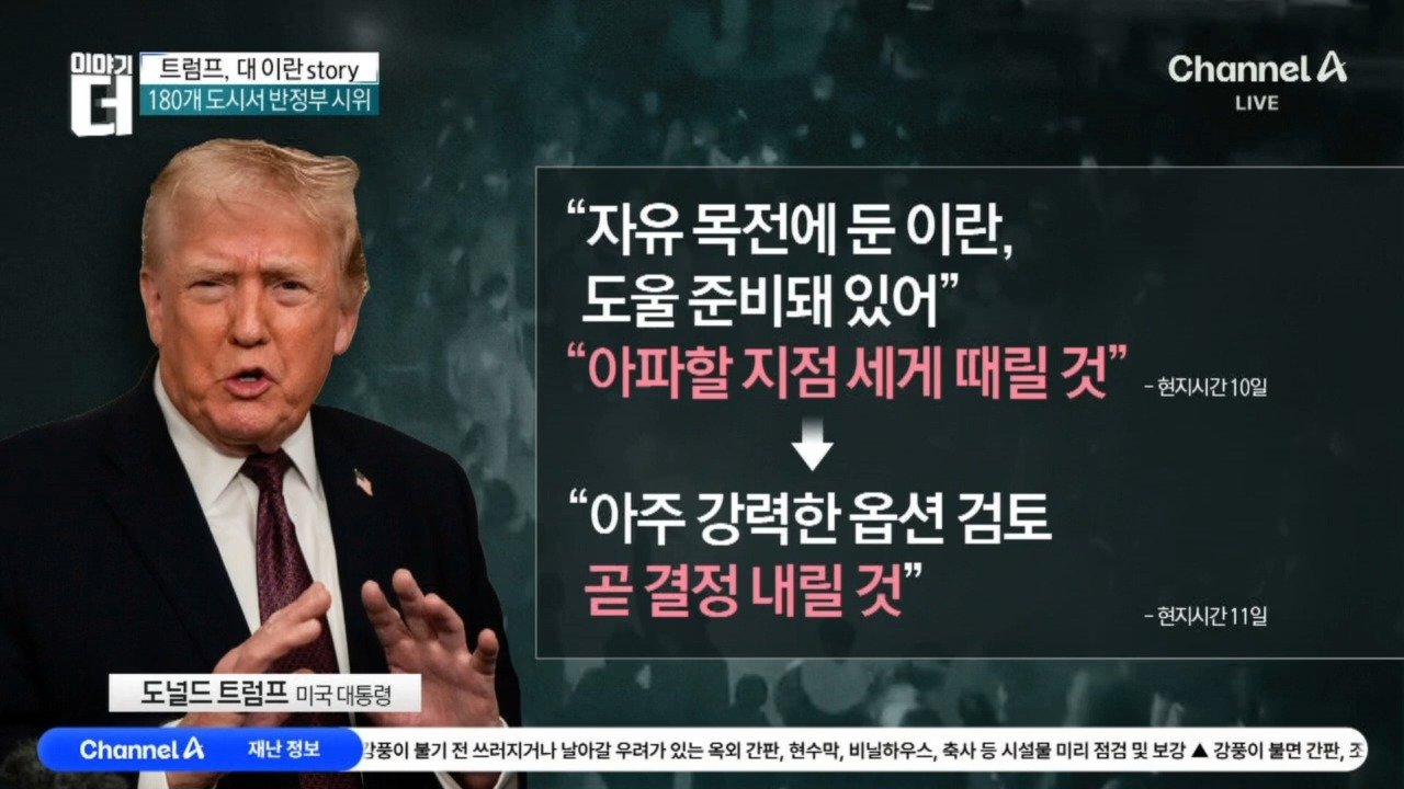 재생 0회 | 등록 2026.01.12트럼프 "강력한 선택지 검토… 곧 결정 내릴 것" 트럼프 "이란 군사 개입 강력한 선택지 검토 중" 트럼프, 작년 이란 핵 …