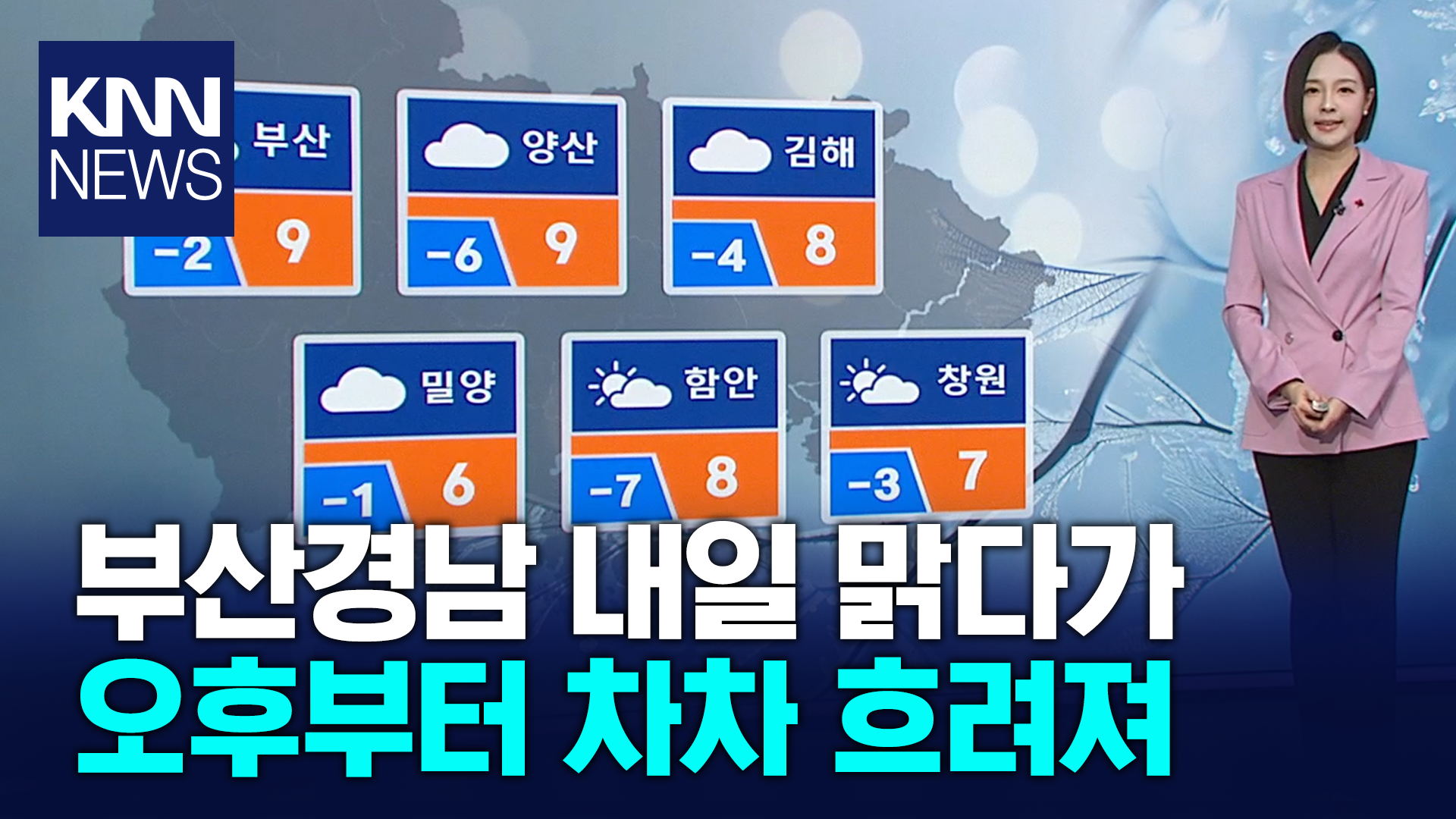 재생 0회 | 등록 2026.01.13수요일인 내일(14) 부산경남은 대체로 맑다가 오후부터 차차 흐려지겠습니다. 오늘 잠깐 올랐던 기온은 다시 뚝 떨어지면서 최…