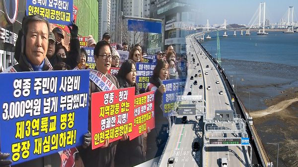 인천시가 제3연륙교 명칭으로 결정한 ′청라하늘대교′에 대한 국가지명위원회 심의가 진행됐습니다. 영종 주민들은 중립적인 명칭을 사용해야 한다며 집회까지 개최했는데요. 최종 결정은 이번 주 안에 통보될 예정입니다. 이상호 기자입니다.