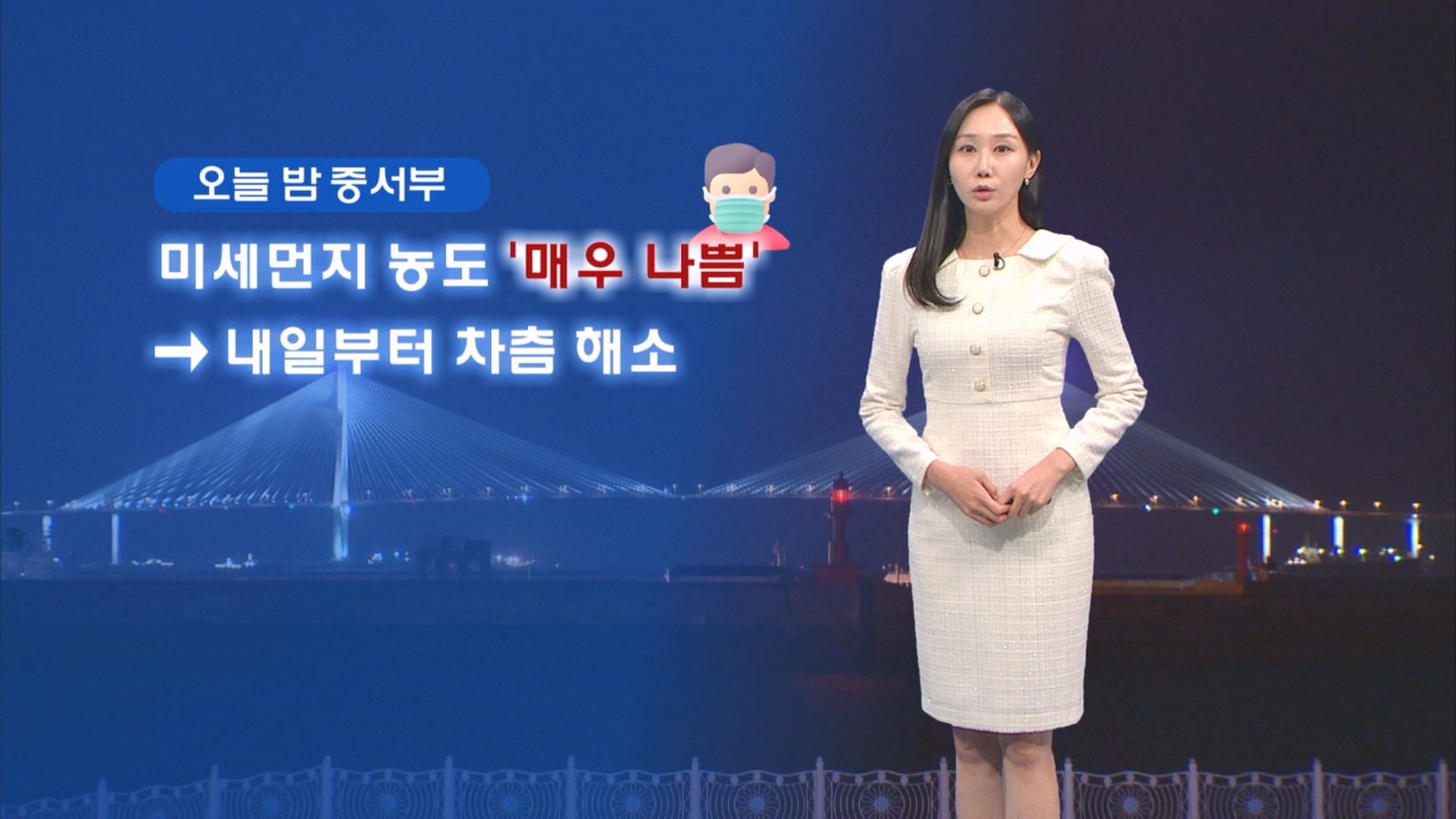 지금도 전국 대부분 지역의 공기질이 좋지 않습니다. 특히, 중서부 곳곳은 밤까지 미세먼지 농도가 매우 나쁨으로 오를 수 있겠는데요. 내일 오전에 중서부 지역부터 점차 해소되겠고, 오후에는 전국이 좋음에서 보통 수준을 회복하겠습니다. 이번 주말과 휴일에도 큰 추위는 없겠지만, 아침에는 영하권 추위가 나타나겠습니다. 한편, 동해안 지역의 대기는 계속해서 건조해 산불 등 화재사고에 유의하셔야겠고요. 새벽까지 전국 많은 지역에는 안개가 짙게 낄 수 있어 교통안전에도 주의하시길 바랍니다. 이어서 내일 전국 기온 보시면, 아침에 서울 -4도, 대전 -2도, 대구 1도로 출발하겠고요. 한낮에는 서울 3도, 광주와 대구 10도로 오르겠습니다. 수도권 지역은 인천이 아침 최저 -5도, 연천은 영하9도를 기록하겠습니다. 여주는 낮 최고 5도로 오르겠고, 안성도 5도를 보이겠습니다. 내일 서해상과 동해상의 물결은 높게 일겠습니다. 다음주는 강한 추위에 대한 대비를 잘 해주셔야겠습니다. 날씨였습니다.