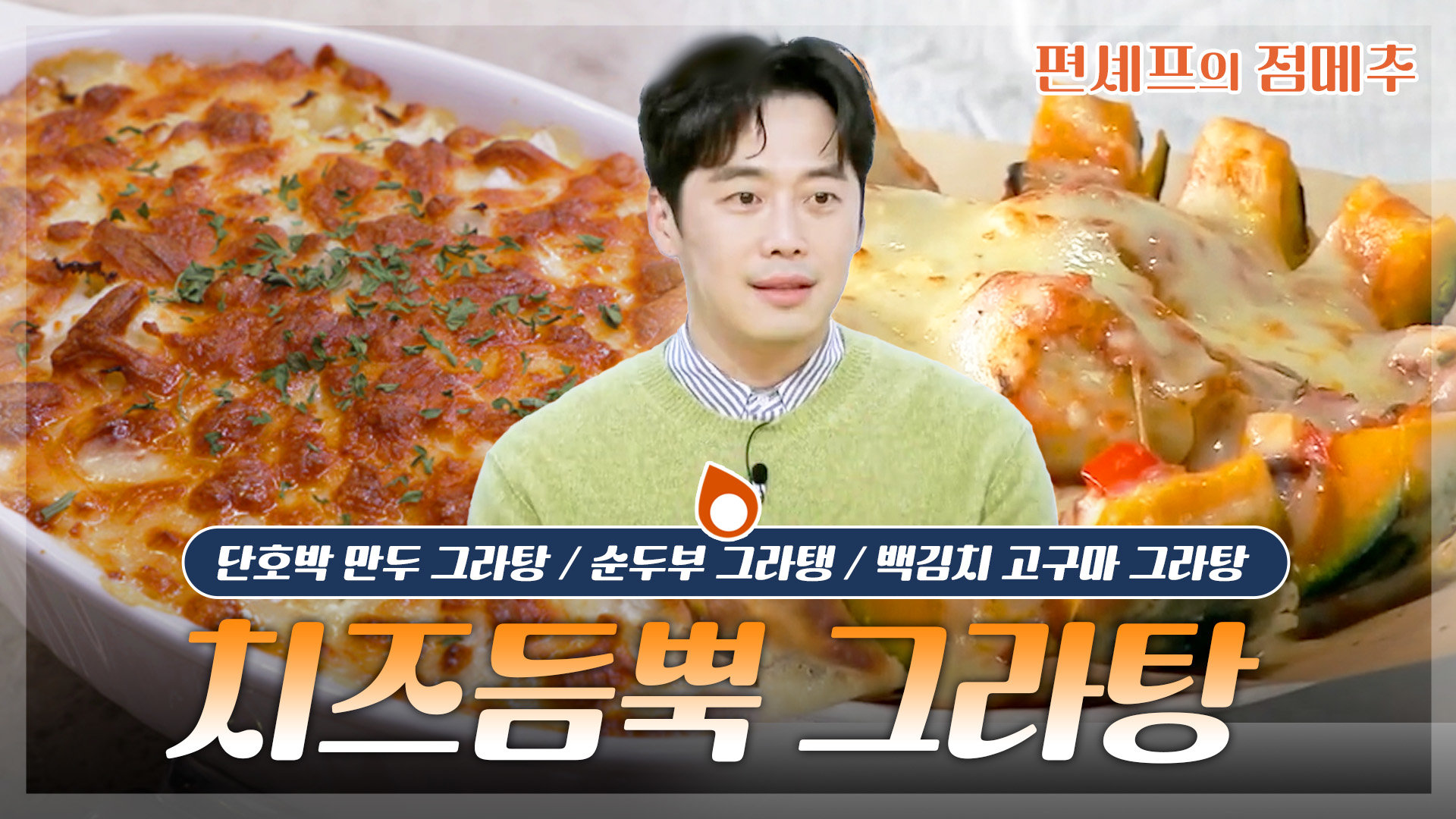 편집자가 추천하는 점심 메뉴 레시피 어디서도 볼 수 없는 비법까지! 00:00 백김치 고구마 그라탕 ■ 요리 재료 고구마 3개, 파스닙 1개, 백김치 잎 2장, 양송이버섯 4개, 양파 1개, 자숙 새우 반 컵, 우유 2.5컵새우 100g, 양파 반 개, 양송이버섯 3개, 우유, 소금, 후추, 백김치 100g, 피자 치즈 100g ■ 만드는 법 1. 백김치 잎 2장은 잘게 다지고,파스닙 1개는 껍질을 벗긴 후 가운데 심지를 제거하고 잘게 다진다. 2. 양파 1개는 잘게 다지고, 양송이버섯 4개는 밑동을 제거하고 슬라이스한다.자숙 새우는 꼬리를 제거한 후 잘게 잘라준다. 3. 고구마 3개는 껍질을 벗긴 후 듬성듬성 잘라 찜기에 넣고 20분간 익힌 후 으깨준다. 4. 올리브오일을 두른 팬에 양파, 양송이, 파스닙, 다진 마늘 0.5T, 후추 한 꼬집, 소금 두 꼬집을 넣고 볶아준다. 5. 양파가 투명해지면 자숙 새우 반 컵을 넣고 볶아준다. 6. 에 으깬 고구마와 우유 2.5컵을 넣고 재료들이 걸쭉해질 때까지 끓여준다. 7. 오븐용 그릇에 ⑥을 넣고 백김치를 골고루 올린 후 피자 치즈 100g을 뿌려준다. 8. 200℃에서 예열한 오븐에 그라탱을 넣고 10분간 구워준다. 9. 그라탱 위에 파슬리를 올려 완성한다. 04:34 단호박 만두 그라탕 ■ 요리 재료 [단호박 손질] 단호박 1개, 베이킹소다 2T [최종 완성] 양파 1/4개, 빨간 파프리카 1/4개, 표고버섯 2개, 고기만두 5개, 고기깻잎만두 1개, 땡초만두 1개, 김치만두 1개, 다진 마늘 1T, 토마토소스 7T, 피자치즈 110g, 소금, 후 ■ 만드는 법 [단호박 손질] 1. 단호박은 1개를 찬물에 담근 후 껍질에 베이킹소다 2T를 뿌려 손으로 문지르며 닦아준다. 2. 흐르는 물에 단호박을 깨끗이 씻어준다. 3. 전자레인지에 단호박을 넣고 10분간 돌려준다. 4. 단호박 윗부분 2cm 정도를 잘라낸 후 속을 파낸다. [최종완성] 1. 양파 1/4개, 빨간 파프리카 1/4개, 표고버섯 2개는 1.5cm 큐브 모양으로 잘라준다. 2. 오목한 그릇에 고기만두, 고기깻잎만두, 땡초만두, 김치만두를 1개씩을 넣고 물 2T를 뿌린다.랩으로 그릇을 덮고 랩에 구멍을 낸 후 전자레인지에 2분간 돌려준다. 3. 오목한 그릇에 고기만두 4개를 ②와 같은 방법으로 데운 후 피와 만두소를 분리한다. 4. 중불에 예열한 프라이팬에 올리브유를 두르고 다진 마늘 1T를 볶다가 ①의 자른 채소를 넣고 양파가 투명해질 때까지 볶아준다. 5. 채소에 소금과 후추 두 꼬집을 넣고 간한 후 ③의 만두소와 토마토소스 7T를 넣고 볶아준다. 6. 단호박 안에 소스 3T, ②의 만두 4개, 소스 2T를 순서대로 넣어준다. 7. 피자 치즈 110g을 올리고 200℃로 예열한 오븐에 15분간 구워준다. 8. 단호박을 12등분 해 꽃처럼 펼쳐준다. *레시피는 편스토랑 인스타그램에서도 확인할 수 있습니다 @funstaurant_kbs #편스토랑 #K푸드 #KFOOD #KOREAFOOD #레시피 #recipe #음식 #메뉴 #추천 #김치전 #편셰프의점메추 #점메추 Copyright ⓒ KBS. All rights reserved. 무단 전재, 재배포 및 이용(AI 학습 포함) 금지
