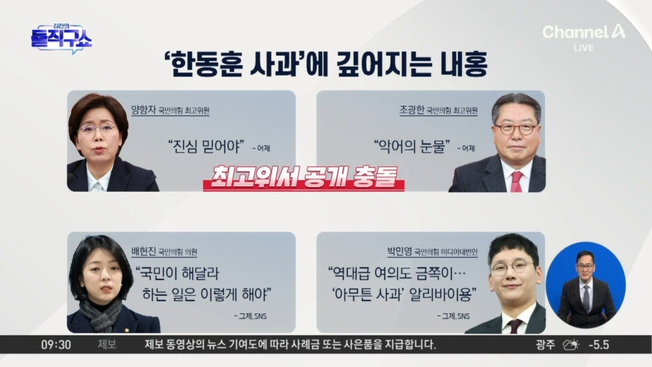 조선 "韓 사과는 악어의 눈물" 평가절하…일부 최고위원은 張 단식에 합류 서울 "진심 그대로 믿어야" "악어의 눈물"…당 지도부, 사과 진정성에 이견 분출 한동훈 사과에…장동혁 선택은? Copyright Ⓒ 채널A. All rights reserved. 무단 전재, 재배포 및 AI학습 이용 금지