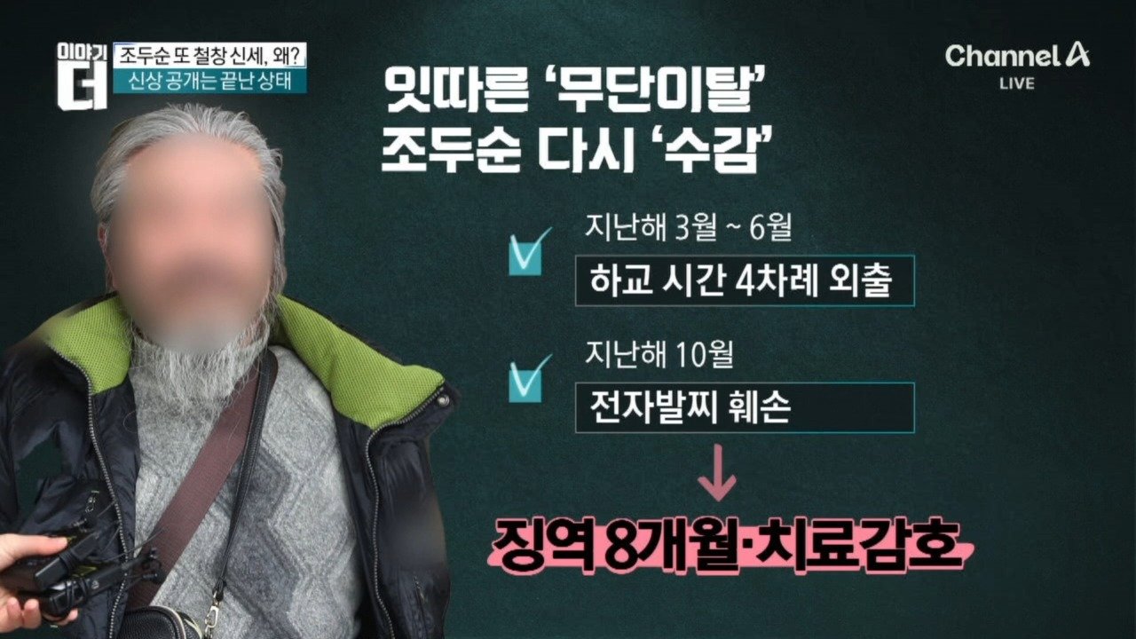 재생 0회 | 등록 2026.01.28조두순, 무단 외출 등 징역 8개월·치료감호 선고 법원 "조두순, 치료받지 않을 경우 재범의 위험" 法 "조두순, 심신미약 …