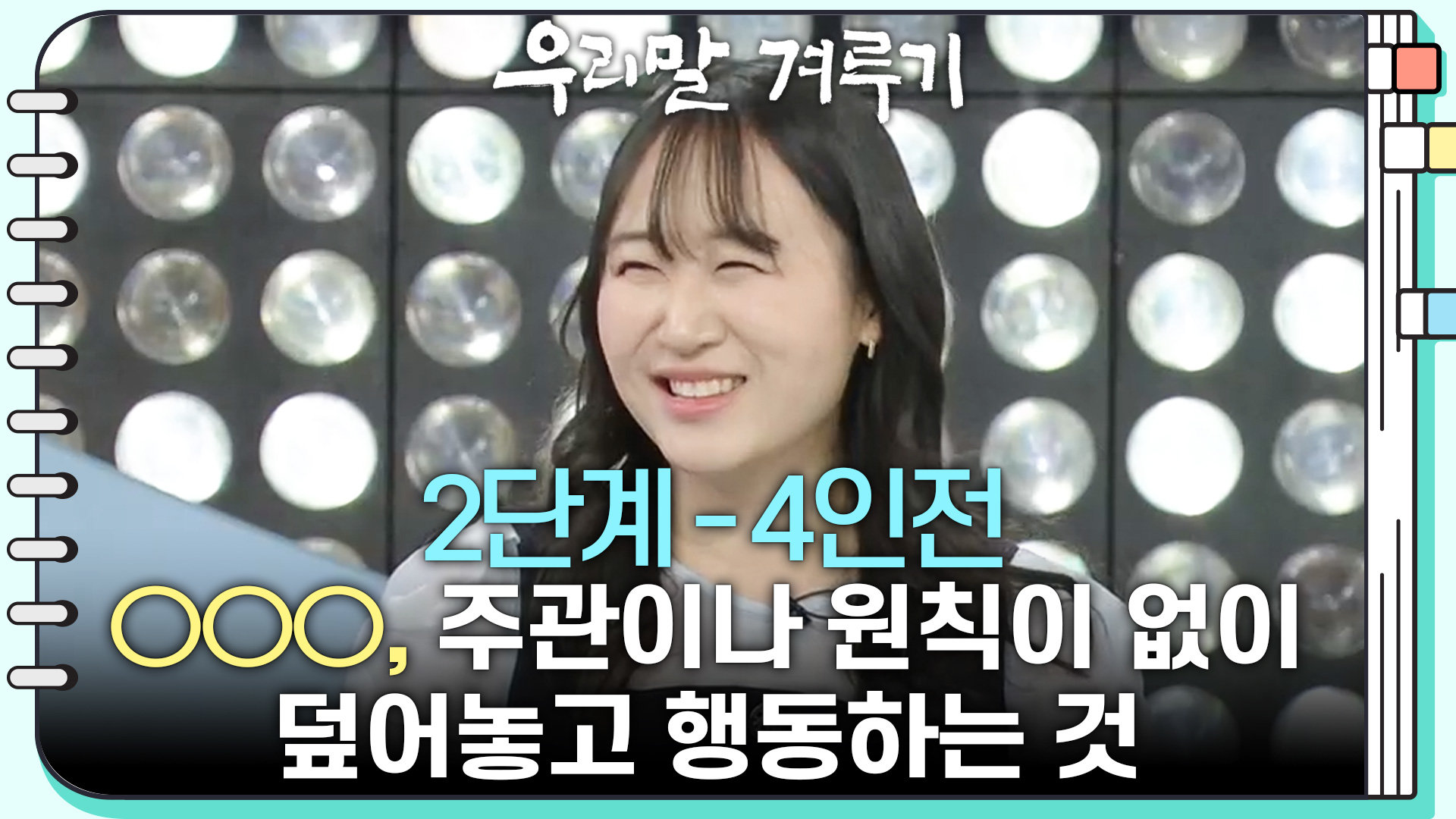 재생 0회 | 등록 2026.02.09[2단계 - 4인전] ○○○, 주관이나 원칙이 없이 덮어놓고 행동하는 것 Copyright ⓒ KBS. All rights …
