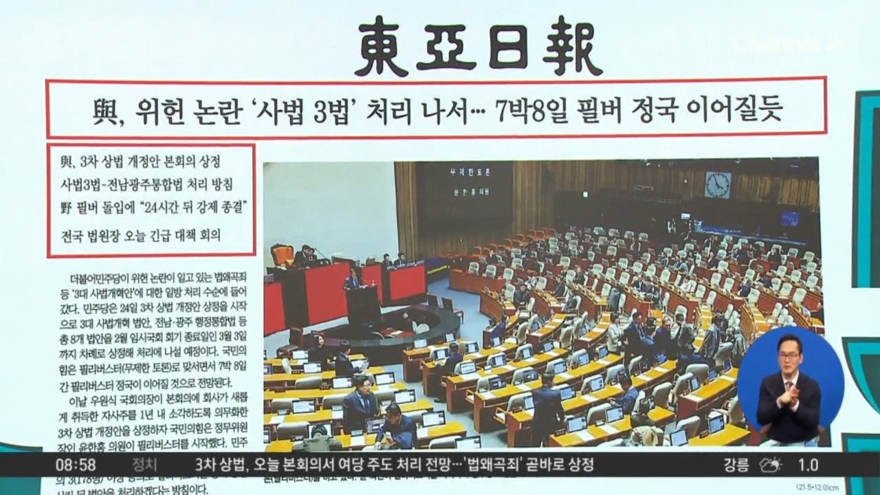 재생 0회 | 등록 2026.02.25<동아> 與, 위헌 논란 ‘사법 3법’ 처리 나서…7박8일 필버 정국 이어질 듯 <중앙> 면담 요구받은 장동혁, 그만하겠다는…