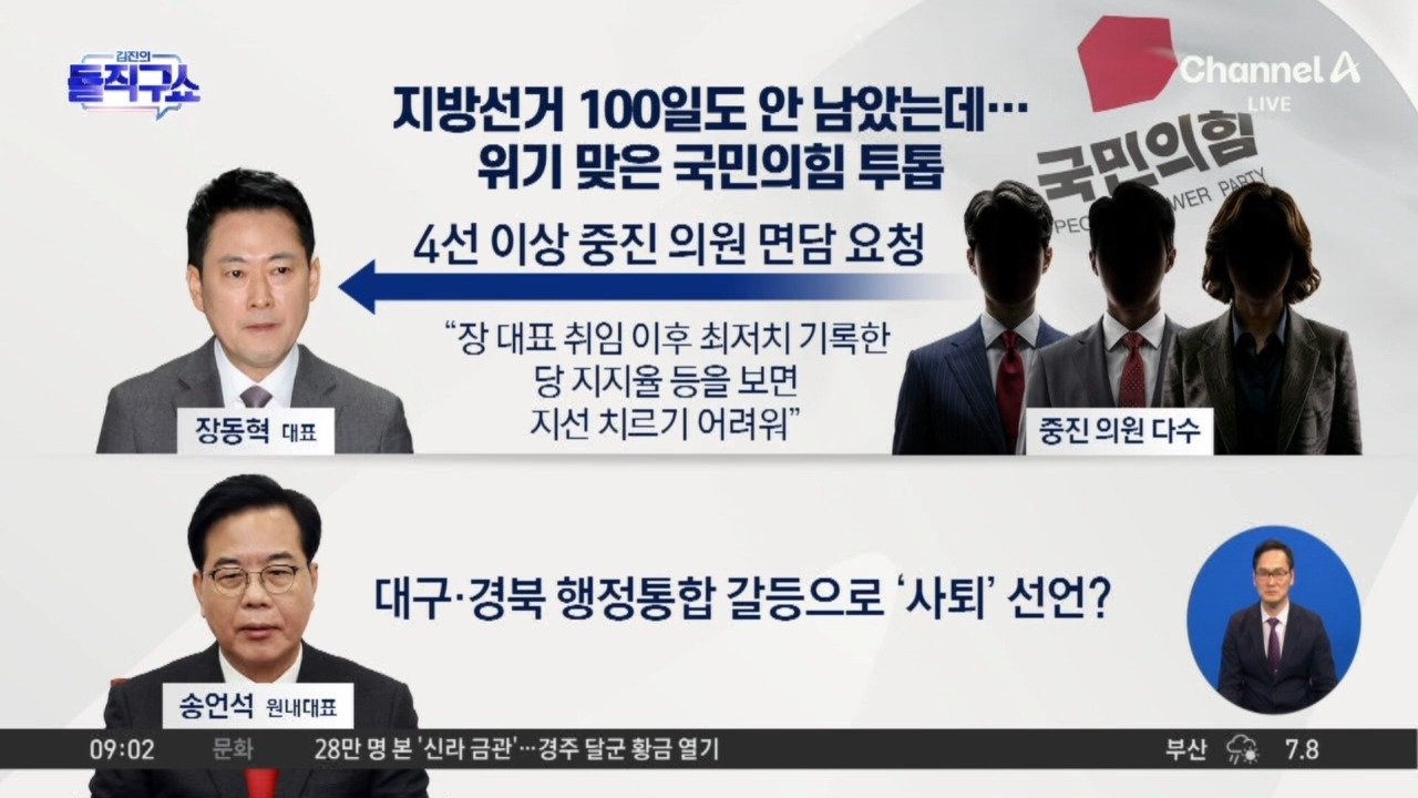 중앙 4선 이상 중진 14명, 장에 면담 요청 행정통합 갈등, 원내대표 사의 표명 서울 주호영 "지도부 책임" 송언석 "사의" TK 통합 무산에 국힘 내부서도 충돌 동아 野 내부 "대구경북 통합 누가 반대했나" 송언석 "명예훼손" 사의 표명 Copyright Ⓒ 채널A. All rights reserved. 무단 전재, 재배포 및 AI학습 이용 금지