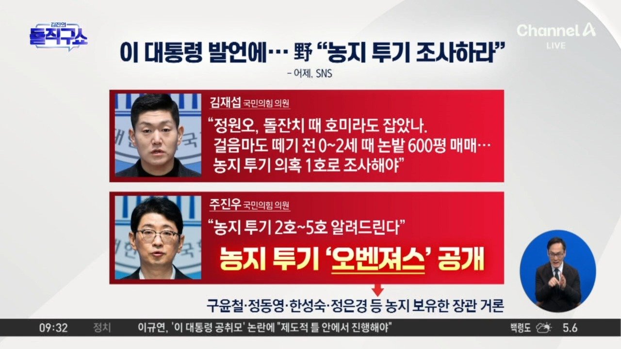 동아 李 "농지 강제 매각에 공산당 운운…이승만도 빨갱이인가" 동아 "투기 목적 구입 농지 매각 말한 것" 동아 野 "0세 때 논 매매 정원오 조사를" 鄭 "부모가 실제 농사… 현재 맹지" Copyright Ⓒ 채널A. All rights reserved. 무단 전재, 재배포 및 AI학습 이용 금지