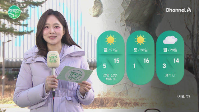 전국 맑다가 차차 흐려짐 기온 온화 영남해안과 제주해안을 중심으로 강풍과 너울 주의 활기가 넘치는 '행복한 아침'이 시작됩니다! '행복한 아침' 월~금 아침 7시 30분 방송 Copyright Ⓒ 채널A. All rights reserved. 무단 전재, 재배포 및 AI학습 이용 금지