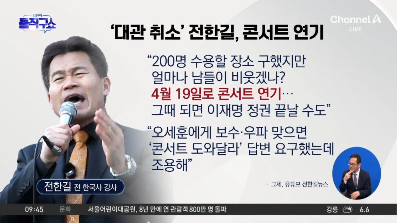 09:45재생중[핫피플]전한길 “오세훈 답 없어…4월 19일로 콘서트 연기”