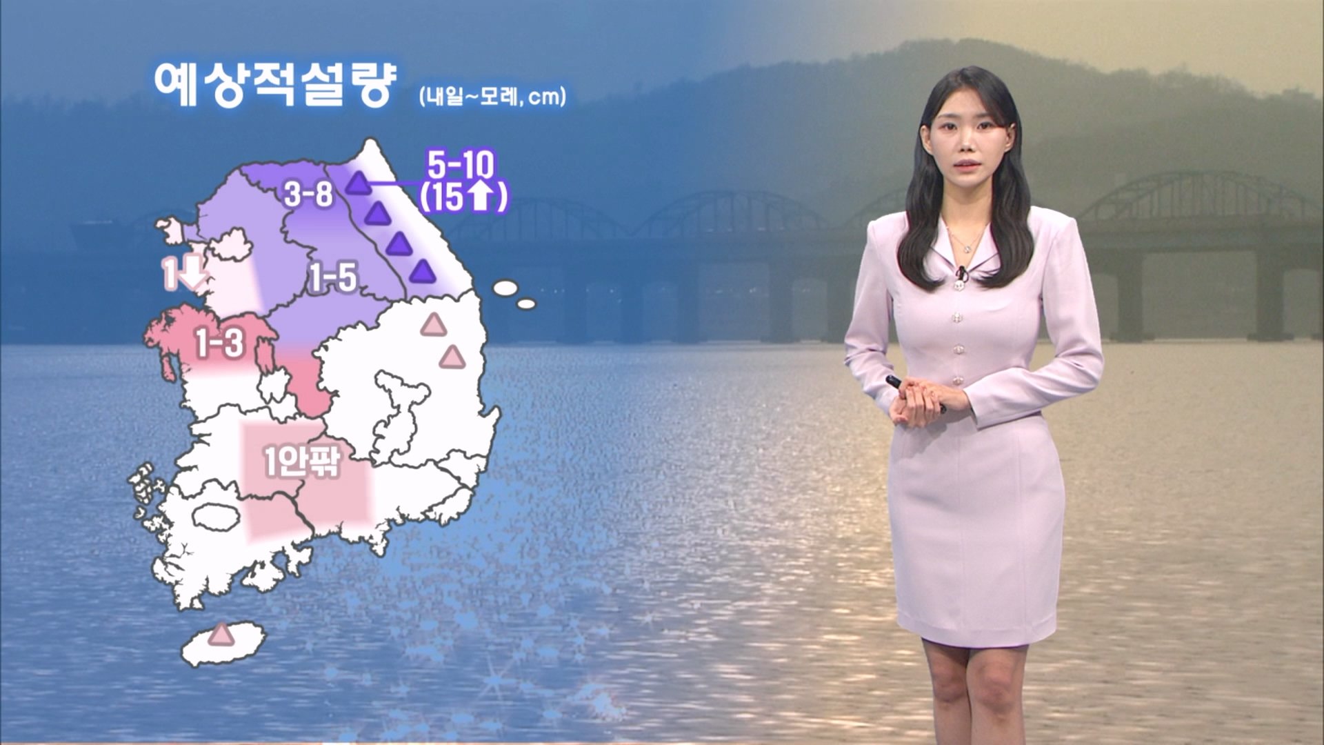 내일 밤부터 모레사이 전국 대부분 지역에는 비 또는 눈이 내리겠습니다. 우선 예상되는 적설양을 보시면, 강원산지 많은 곳에는 15cm 이상의 많은 눈이 내리겠고요 강원 북부내륙에도 최대 8cm가 예상됩니다. 수도권을 포함한 서쪽 곳곳에도 1-5cm의 눈이 내리겠습니다. 또 전국에는 5-20mm의 비가 내릴것으로 예상되는 만큼 도로 미끄러움에 유의하셔야겠습니다. 내일 밤부터 모레 새벽 사이에는 강원중북부 내륙과 강원산지에 시간당 1-3cm의 눈이 집중되기도 하겠습니다. 안전사고 각별히 유의하셔야겠습니다. 이어서 자세한 내일 기온보시면 서울 아침 2도, 대전 -1도, 대구 2도에서 출발하겠고요, 인천 아침기온 1도, 낮기온 10도 예상됩니다. 경기북부지역 연천 아침기온 -2도, 경기동부지역 가평 아침 -2도 보이겠고, 경기남부지역 낮기온 -도 안팎까지 오르겠습니다. 동해상 바람강하겠고 물결 3.5m까지 높게 일겠습니다. 내일 전국 내륙으로는 15도 안팎의 큰 일교차에 유의하셔야겠습니다. 날씨였습니다.