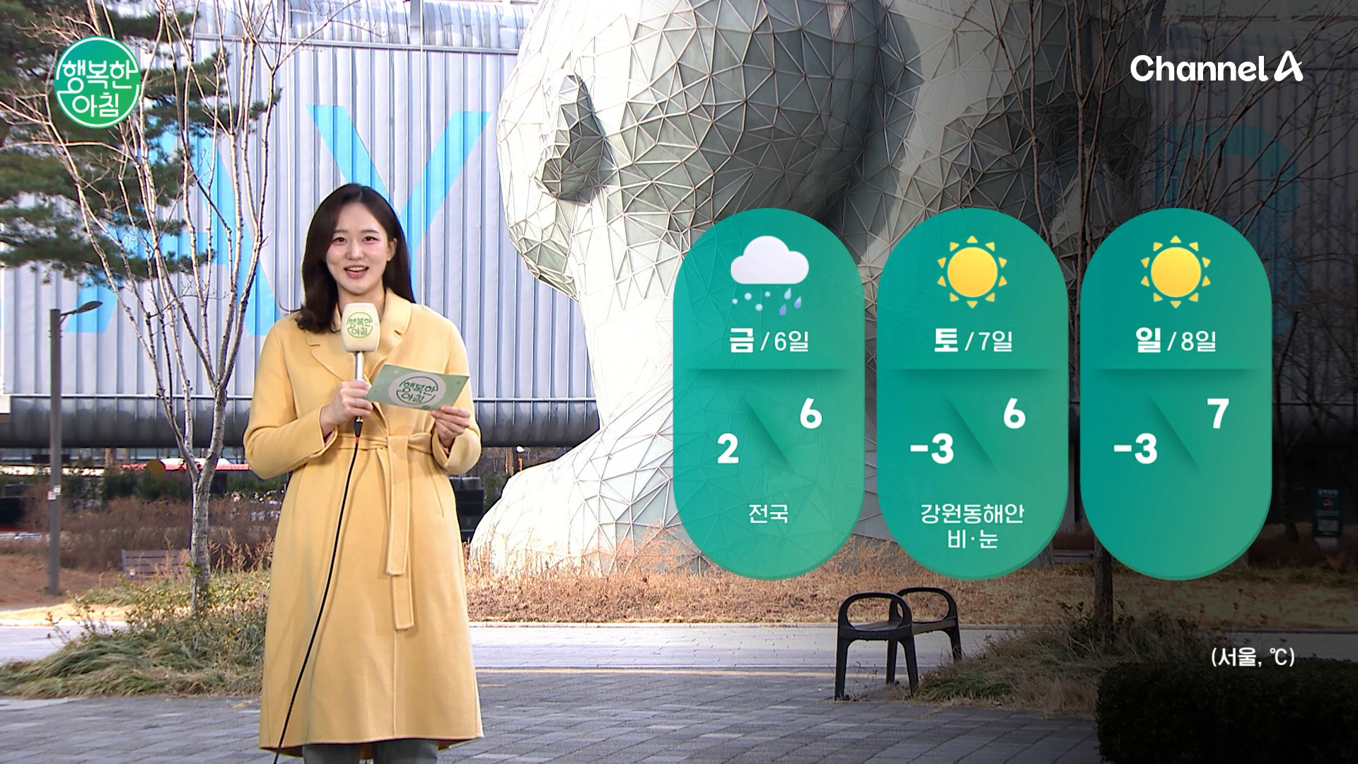 중부,전북부터 시작해 밤에는 전국에 비나 눈 예상 강수량 5~20mm 일교차 큰 하루 내일 오전 비,눈 그쳐 주말 아침 영하권 활기가 넘치는 '행복한 아침'이 시작됩니다! '행복한 아침' 월~금 아침 7시 30분 방송 Copyright Ⓒ 채널A. All rights reserved. 무단 전재, 재배포 및 AI학습 이용 금지
