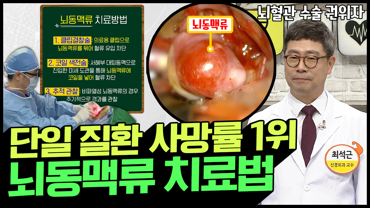 #뇌동맥류 #뇌출혈 #뇌혈관 00:00 최대 사망률 67%...!? ‘침묵의 살인자’라 불리는 이것! ▶뇌동맥류◀ 00:50 달라도 너무 달라(;´д`)ゞ 뇌동맥류 치료방법 02:06 세밀함 끝판왕… 뇌동맥류 실제 수술 과정 대공개!! 04:42 머리를 열지 않는 뇌수술!? 뇌동맥류 치료법 두 번째, 코일 색전술 07:08 추적관찰로 치료하는 비파열성 뇌동맥류, 자연적으로 소멸될까요? 07:53 혈관 건강이 중요 뇌동맥류 예방법! 세상을 건강하게 할 특급 비책 ‘나는 몸신이다’ 매주 목요일 밤 8시 10분 방송