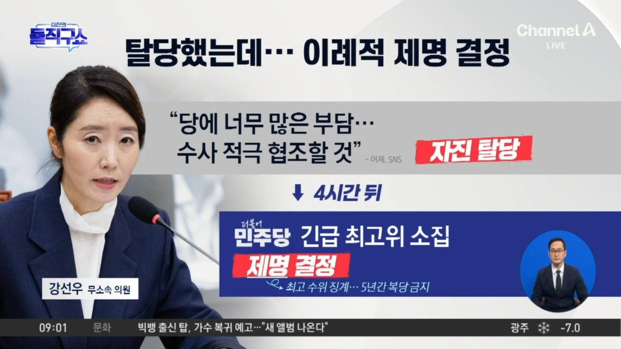 07:14재생중‘공천헌금 의혹’ 강선우 제명…與 한밤 긴급 최고위서 결정