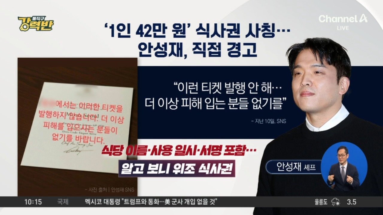 "이 식사권은 가짜"… 안성재, 식당 사칭 주의 당부 한끼 120만 원?… 식사권 사기 기승 안성재 "이런 티켓 가짜입니다"… '사칭' 사기 경고 Copyright Ⓒ 채널A. All rights reserved. 무단 전재, 재배포 및 AI학습 이용 금지
