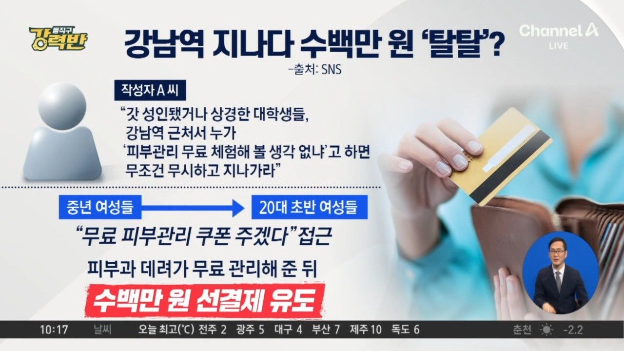 20대 초반 여성 타깃… "무료 쿠폰 줄게" 유인 "무료 쿠폰 준다" 유인한 후 수백만 원 강매 "얼떨결에 수백만 원 결제"… 피부 관리 상술 논란 Copyright Ⓒ 채널A. All rights reserved. 무단 전재, 재배포 및 AI학습 이용 금지