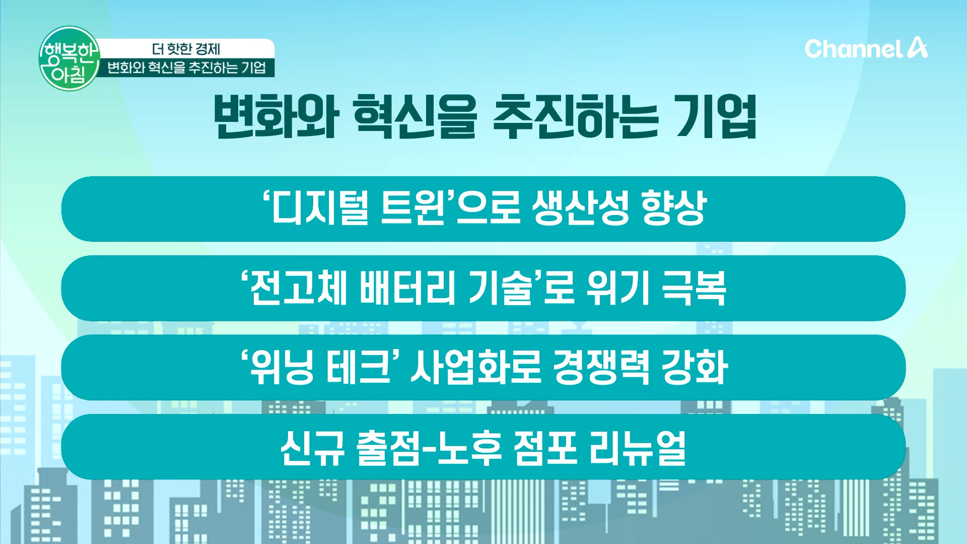 종합 중공업 기업H사 디지털 트윈으로 생산성 향상 에너지,화학 기업 S사 전고체 배터리 기술로 위기 극복 종합 전자 기업L사 위닝테크 사업화로 경쟁력 강화 유통 전문 기업 E사 신규출점과 노후 점포 리뉴얼 활기가 넘치는 '행복한 아침'이 시작됩니다! '행복한 아침' 월~금 아침 7시 30분 방송 Copyright Ⓒ 채널A. All rights reserved. 무단 전재, 재배포 및 AI학습 이용 금지