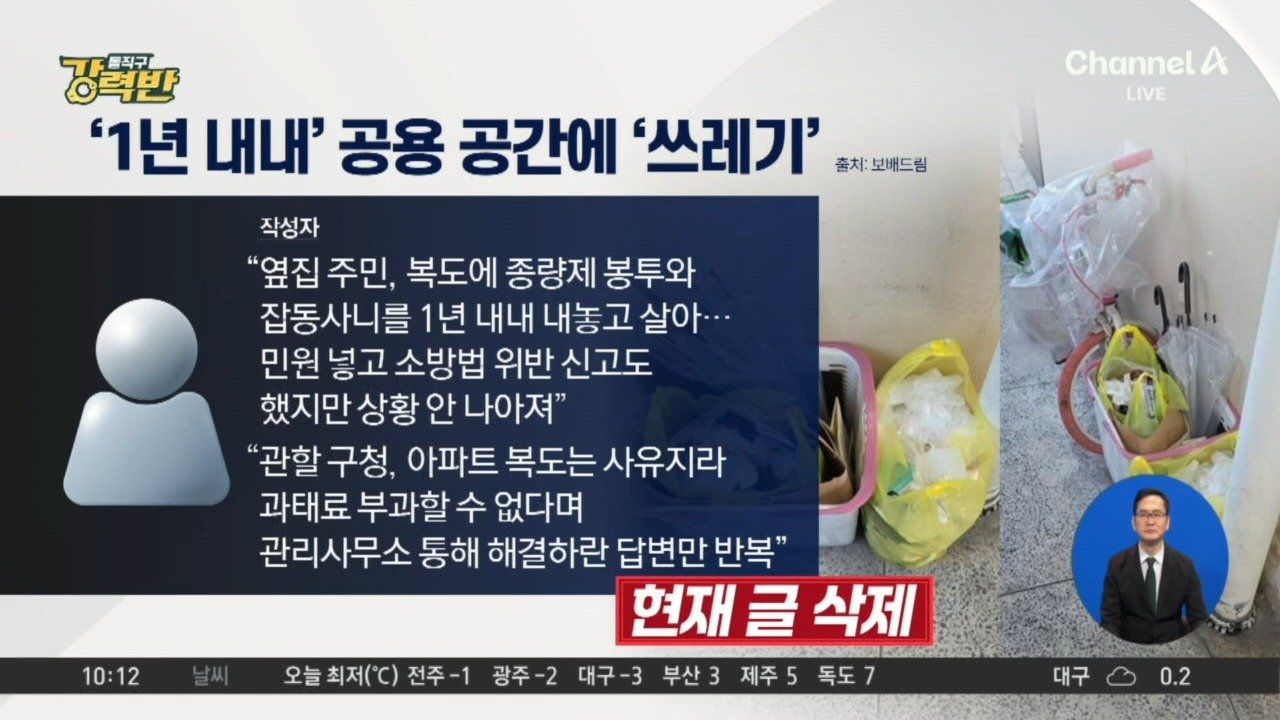 365일 '복도에 쓰레기' 방치한 이웃… 작성자 '고통 호소' 구청 신고했지만 "사유지라 과태료 부과 못 해" 답변만 복도에 물건 두면 300만 원 이하 과태료 부과 가능 Copyright Ⓒ 채널A. All rights reserved. 무단 전재, 재배포 및 AI학습 이용 금지