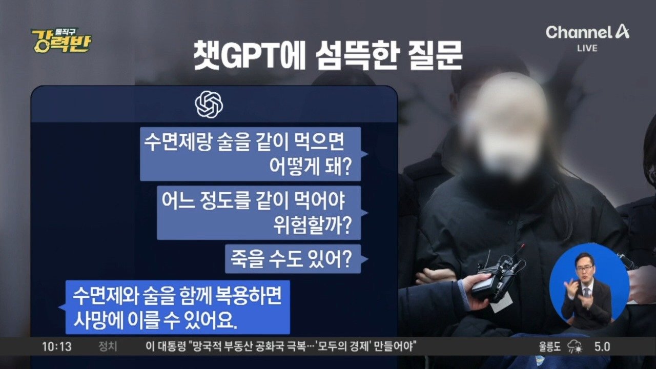 07:01재생중[돌직구 강력반]‘모텔 연쇄 사망’ 피의자, 챗GPT에 ‘수면제와 술’ 검색