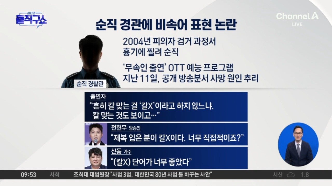 OTT 예능 망자 사인 맞히는 미션서 부적절 표현 순직 소방관 이어 순직 경찰관 사망 경위 다뤄 순직 경찰에 '칼X' 표현… 경찰직협 "공식 사과하라" Copyright Ⓒ 채널A. All rights reserved. 무단 전재, 재배포 및 AI학습 이용 금지