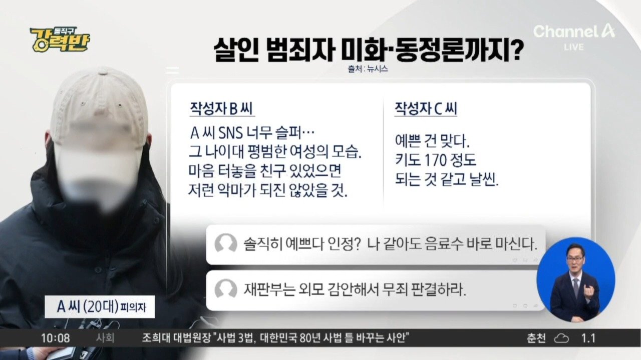 재생 0회 | 등록 2026.02.24온라인서 번지는 가해자 미화… 감형·무죄 주장도 범행 미화 글 줄줄이… "2차 가해" 지적도 살인 혐의 피의자 외모 칭찬글 …