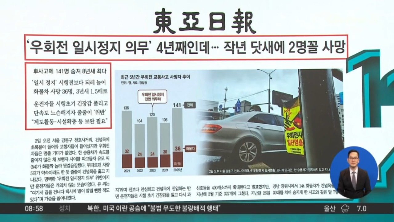 재생 0회 | 등록 2026.03.03<조선> 이란, 주변 9국 때렸다…'중동 전쟁' 조짐 <동아> '우회전 일시정지 의무' 4년째인데…작년 닷새에 2명꼴 사망 …