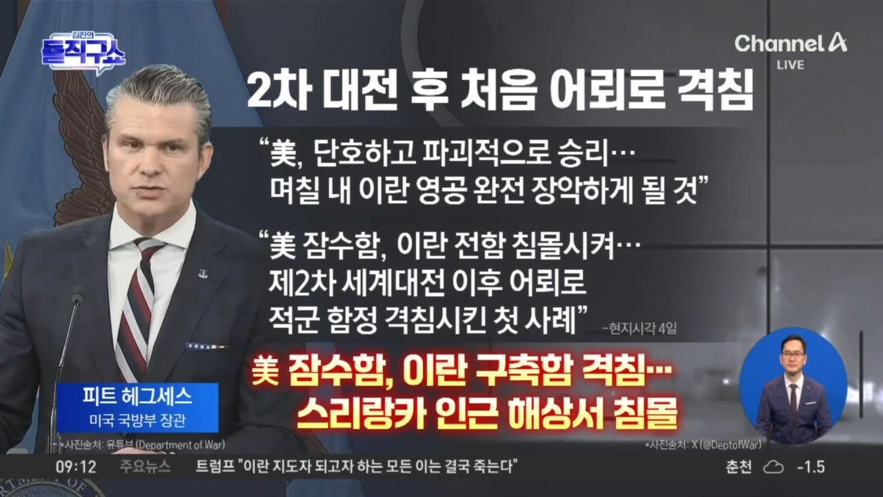 美, 인도양서 잠수함 어뢰로 이란 군함 격침 美 "현재까지 이란 군함 20척 이상 격침" 결사 항전 나선 이란 "중동 군사·경제 인프라 파괴 준비" Copyright Ⓒ 채널A. All rights reserved. 무단 전재, 재배포 및 AI학습 이용 금지