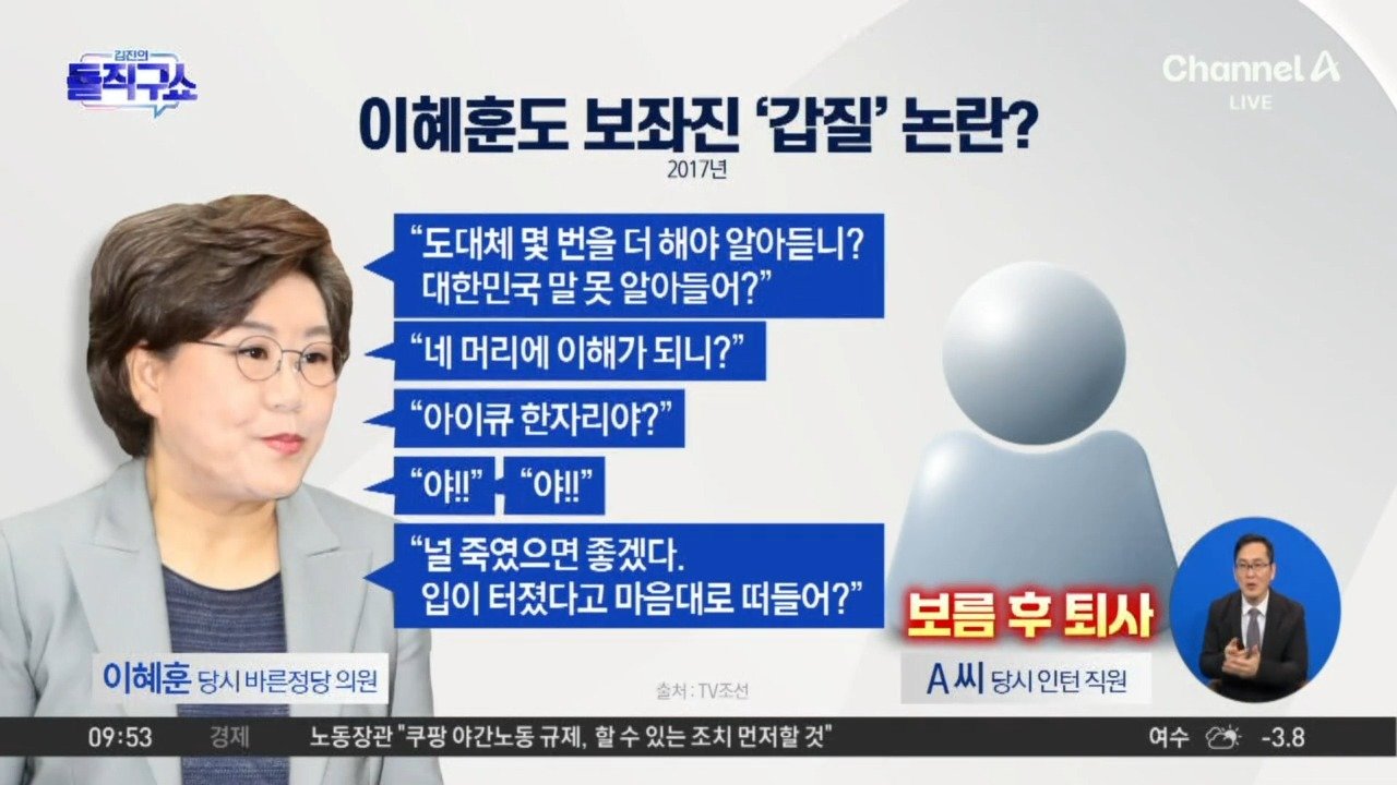 "IQ 한자리야"… 이혜훈도 보좌진 '갑질' 논란 <TV조선> '인턴에 갑질·폭언' 이혜훈 녹취 공개 <TV조선> 이혜훈, 바른정당 의원 시절 인턴 꾸짖으며 "야!" Copyright Ⓒ 채널A. All rights reserved. 무단 전재, 재배포 및 AI학습 이용 금지