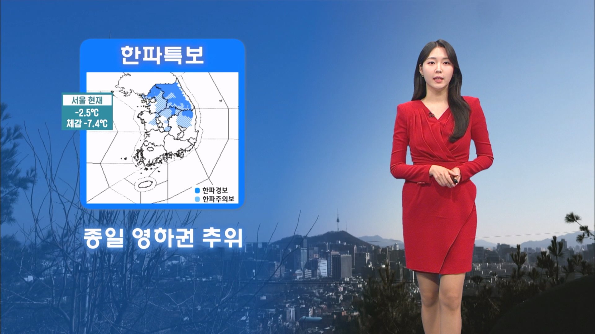 한파가 쉽사리 가시질 않고, 연일 계속되고 있습니다. 중부내륙과 경북내륙 중심으로 한파특보가 장기간 이어지고 있는데요. 현재 서울 기온 -2.5도, 체감온도 -7도 안팎 보이고 있습니다. 외출하신다면 옷차림 두껍게 해주셔야겠습니다. 전국 하늘은 대체로 맑은 가운데 대기가 메말라있는 곳이 많습니다. 오전 10시를 기해서 서울 등 수도권과 강원영동, 영남지역 곳곳으로 건조특보가 확대, 강화됐는데요. 남부지방으론 바람도 강해서 화재사고 유의하셔야겠습니다. 내일 오후부터 밤 사이에는 전남해안과 제주도 곳곳으로 비나 눈이 오겠고, 모레 아침까지 서해안과 제주도에 1에서 최고 5cm의 눈이 쌓이겠습니다. 내일도 중부와 경북 중심으로 -10도 안팎 강추위가 나타나겠습니다. 대전과 대구 아침에 -8도 예상되고요. 서울 -10도에서 출발해 -1도에 머물겠습니다. 경기북부 파주 아침기온 -14도, 경기동부 가평 아침기온 -13도 보이겠고요. 경기남부지역은 -10도 안팎에서 출발하겠습니다. 이번 주 내내 예년 이맘때보다 추운 날씨가 계속될 전망입니다. 날씨였습니다.