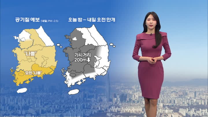 추위가 풀리니 역시 미세먼지가 말썽입니다. 현재 서울 등 수도권을 비롯한 서쪽지역 초미세먼지 농도가 ′나쁨′ 수준을 보이고 있는데요. 내일 오전까지 많은 지역에서 먼지가 남아있겠고요, 오늘 밤부터 내일 오전 사이엔 중부와 호남, 영남내륙에 짙은 안개도 예상돼 시야가 탁할 수 있겠습니다. 호흡기 관리와 교통안전에 유의하시기 바랍니다. 서울 현재기온은 6.8도로, 날은 예년 이맘때보다 포근합니다. 다만 건조특보가 남아 있는 동해안지역 중심으로는 대기가 무척 메말라있고요. 초속 15m 이상 강풍도 더해져 불조심해주셔야겠습니다. 내일 아침엔 영하권에서 출발하겠지만, 낮기온은 영상으로 오르며 일교차가 크겠습니다. 대전은 아침에 -4도, 한낮에 10도 보이겠고요. 서울 -2도에서 출발해 낮기온 9도로 오르겠습니다. 경기북부 연천과 파주 아침에 -6도로 내려가겠고, 경기동부지역 -5도 안팎에서 출발하겠습니다. 경기남부 수원 아침에 -3도, 한낮에 9도 예상됩니다. 해상에서 물결은 대체로 잔잔하게 일겠습니다. 이번 주말에는 낮기온 10도 안팎으로 온화하겠고요. 월요일에는 영동에, 설 연휴 마지막 날인 수요일에는 수도권과 영서에 눈비가 내리겠습니다. 날씨였습니다.