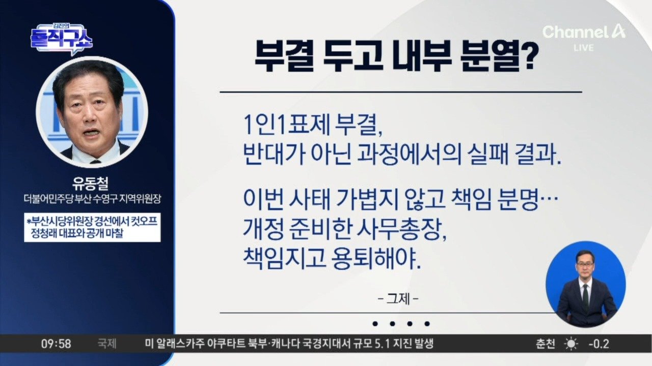 한겨레 '1인 1표제' 부결…정청래 리더십 '타격' 경향 위기의 정청래 리더십…1인 1표제 일단 보류, 공천룰은 재정비 한국 정청래 리더십 타격…불붙는 당권 경쟁 Copyright Ⓒ 채널A. All rights reserved. 무단 전재, 재배포 및 AI학습 이용 금지