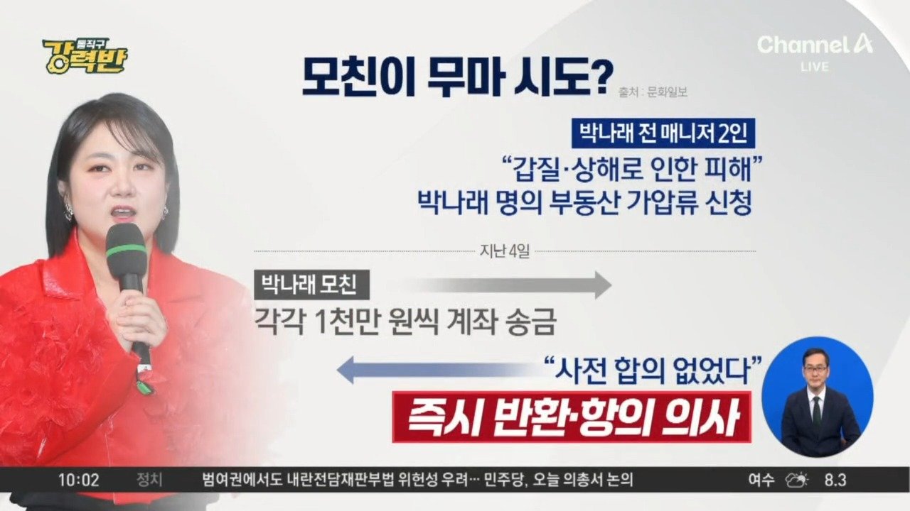 박나래 모친, 전 매니저에 1000만 원씩 입금 박나래 측 "모친, 걱정되는 마음에 단독 행동한 듯" 박나래, 전 매니저들 공갈 혐의로 맞고소 Copyright Ⓒ 채널A. All rights reserved. 무단 전재, 재배포 및 AI학습 이용 금지