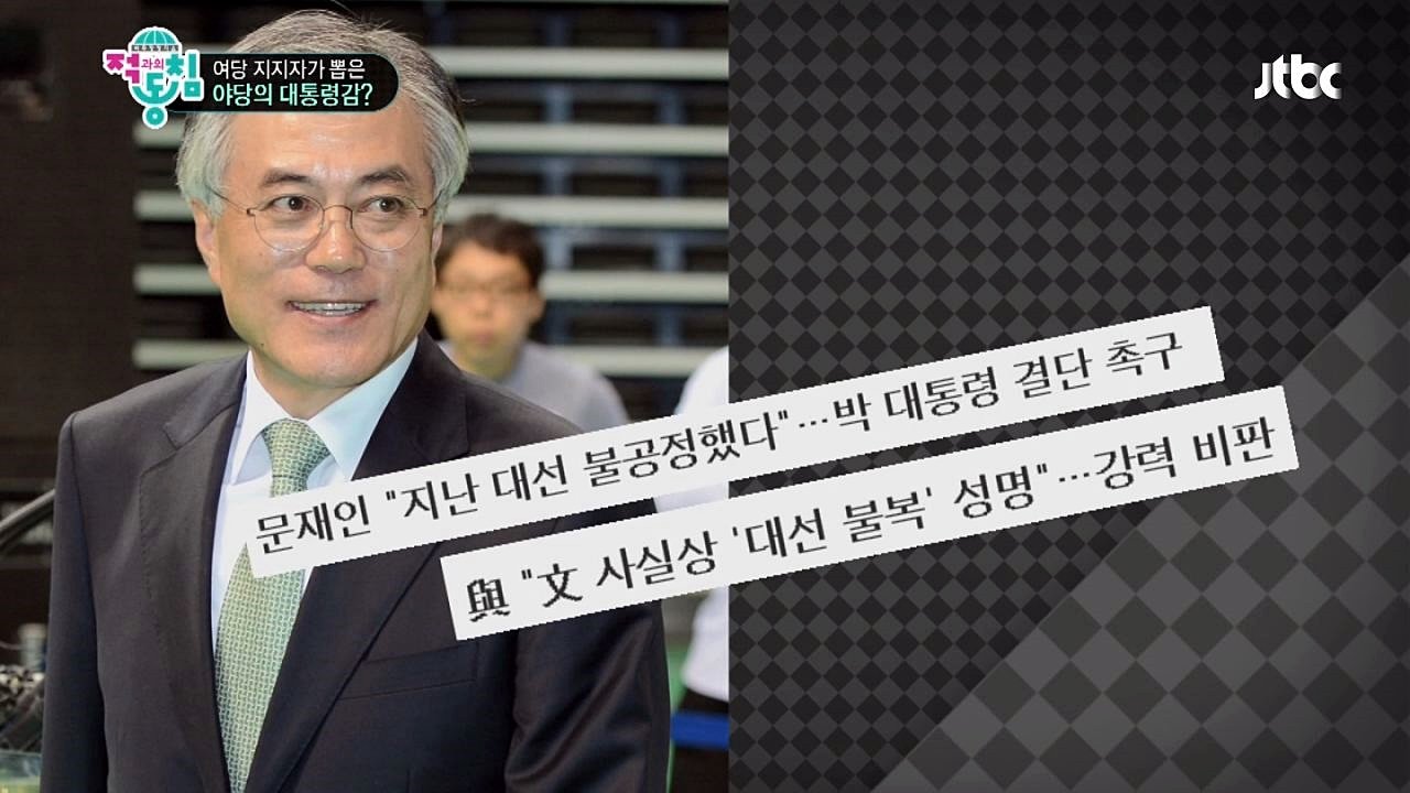최근 핫이슈로 오른 문재인 의원이 여당 지지자가 뽑은 야당 대통령감 2위로 꼽히다! 이에 당연한 결과라는 반응의 민주당과는 달리 여당의 반응은 쎄...한데!! 관련검색어 : jtbc, 적과의 동침, 김구라, 유정현, 국회의원, 의원, 새누리당, 민주당, 여야, 대통령감, 문재인, 유일호, 김성태