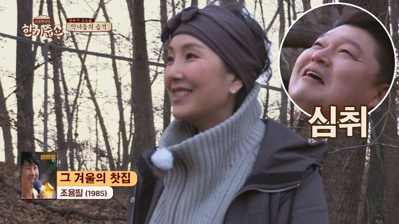 뒤뜰에 있는 등산로를 오르는 강호동&이휘향 지금 이순간 떠오르는 음악은? 조용필의 '그겨울 찻집'♪ 자연에 심취해 절로 나오는 노래