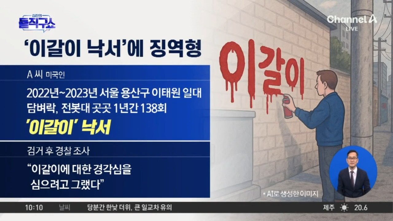 이태원 담벼락·전봇대 곳곳 138회 '이갈이' 낙서 A 씨 "이갈이에 대한 경각심 심어주려 해" 재판부 "예술성 있다고 보기 어려워…불안감 조성" Copyright Ⓒ 채널A. All rights reserved. 무단 전재, 재배포 및 AI학습 이용 금지