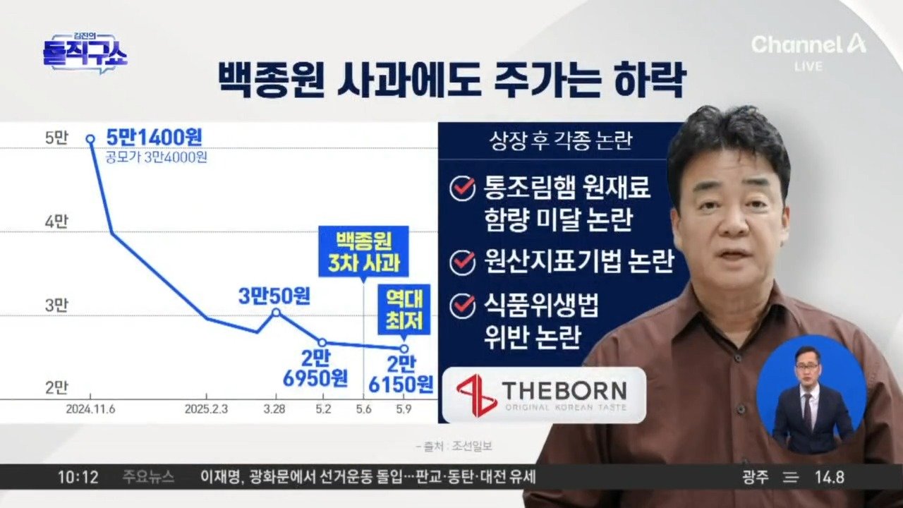 더본 주가 상장일 5만 원→ 2만 원대 추락 위기의 백종원, '최대 반값 할인' 꺼내 더본코리아 "본사서 모든 할인·홍보 비용 지원" Copyright Ⓒ 채널A. All rights reserved. 무단 전재, 재배포 및 AI학습 이용 금지