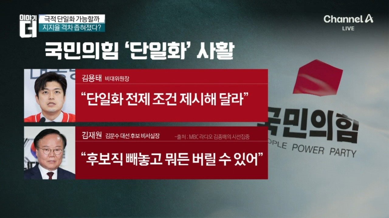 "후보직 빼고 다 준다"… 단일화 사활 건 국민의힘 이준석 "단일화 가능성 0%… 金 사퇴만이 유일" 이준석 "단일화 않으면 정치권 매장 등 협박 들어" Copyright Ⓒ 채널A. All rights reserved. 무단 전재, 재배포 및 AI학습 이용 금지