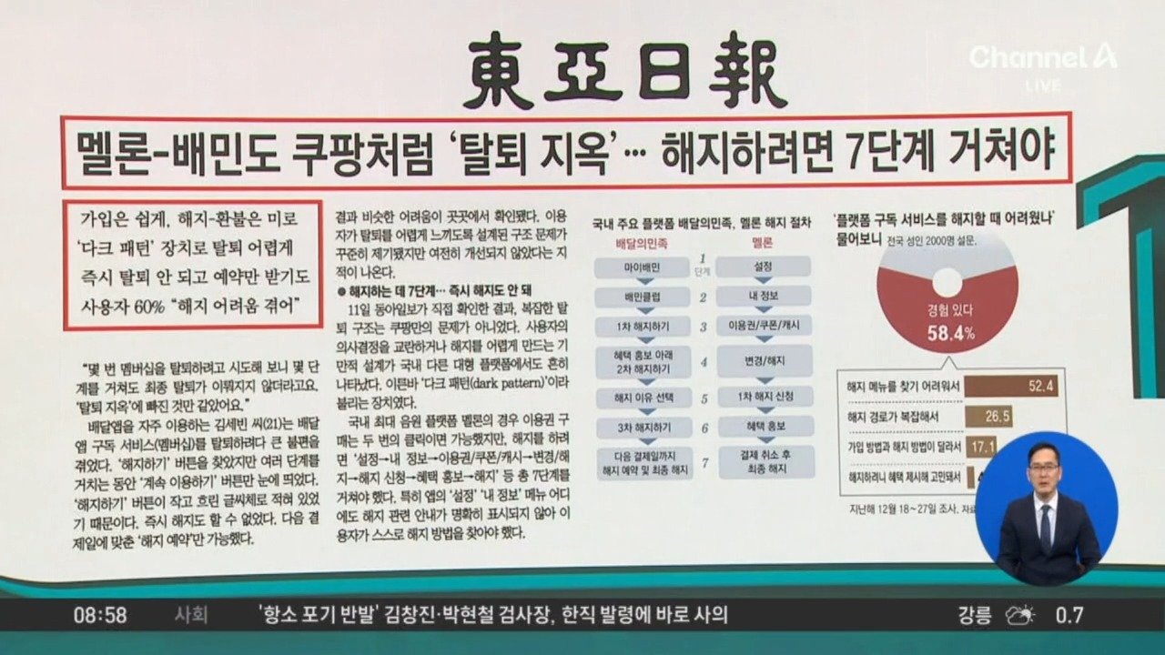 <조선> 전재수 사퇴, 문 열린 '통일교 게이트' <서울> "옥상 지지대 미설치"…광주 도서관 공사장 붕괴, 4명 사상 <동아> 멜론-배민도 쿠팡처럼 '탈퇴 지옥'…해지하려면 7단계 거쳐야 <경향> "반값에 놔드려요" 독감 주사도 '당근' 거래 Copyright Ⓒ 채널A. All rights reserved. 무단 전재, 재배포 및 AI학습 이용 금지