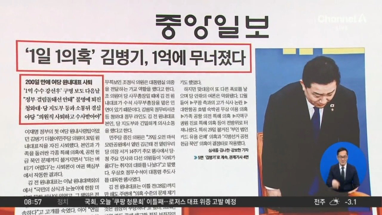 <중앙> '1일 1의혹' 김병기, 1억에 무너졌다 <한국경제> 불타오른 코스피 … 환율 급등은 막지 못했다 <동아> "연장-휴일근로 시간 기록 의무화… 퇴근후 카톡 금지법도 마련" <경향> 여름 25일 늘고, 겨울 22일 줄어…'사계절 뚜렷한 한국' 옛말 Copyright Ⓒ 채널A. All rights reserved. 무단 전재, 재배포 및 AI학습 이용 금지