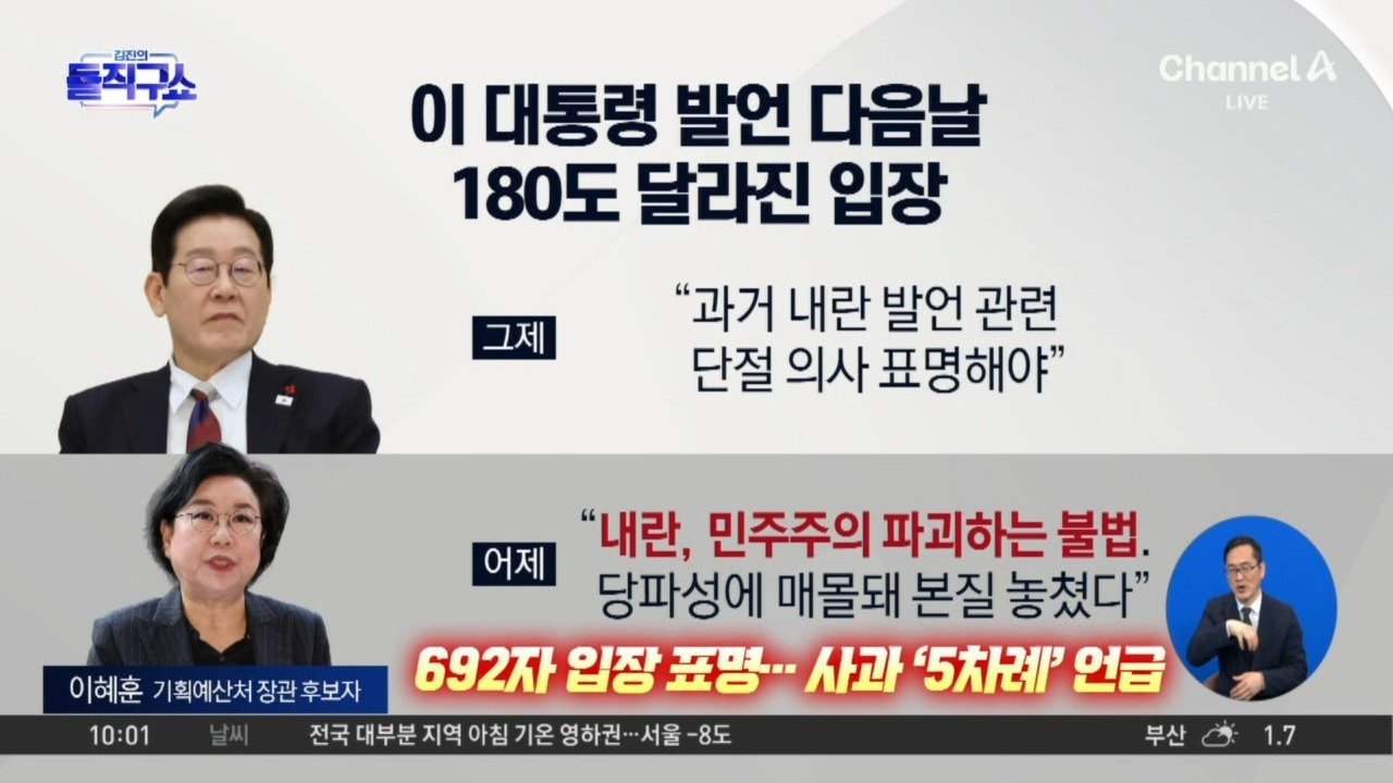 동아 李 '소명' 언급 다음 날 계엄 옹호 사과 "당파성에 매몰돼 사안의 본질 놓쳐" 서울 고개 숙인 이혜훈…"내란은 민주주의 파괴하는 불법" 서울 국힘 "출세만 생각… 앞뒤 안 맞아" Copyright Ⓒ 채널A. All rights reserved. 무단 전재, 재배포 및 AI학습 이용 금지