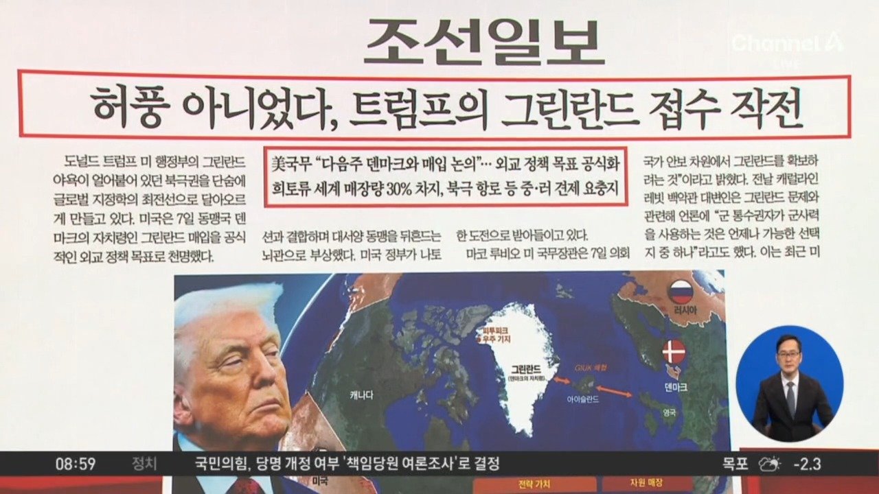 <조선> 허풍 아니었다, 트럼프의 그린란드 접수 작전 <동아> 30년만의 '내란 우두머리' 오늘 구형… 尹, 막판까지 참모 탓 <서울경제> 1박에 200만원 호화출장…임원진은 年13억 직상금 멋대로 <경향> 엄마 아빠 이거…돌잔치야, 돈잔치야? Copyright Ⓒ 채널A. All rights reserved. 무단 전재, 재배포 및 AI학습 이용 금지