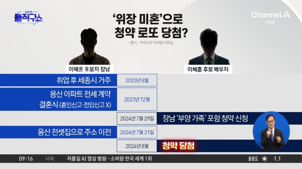 이혜훈 측 "장남의 혼인신고 여부는 몰라" 이혜훈 측 "장남, 평일엔 세종, 주말엔 우리와… 이혜훈 측 "며느리만 용산에 살아" Copyright Ⓒ 채널A. All rights reserved. 무단 전재, 재배포 및 AI학습 이용 금지