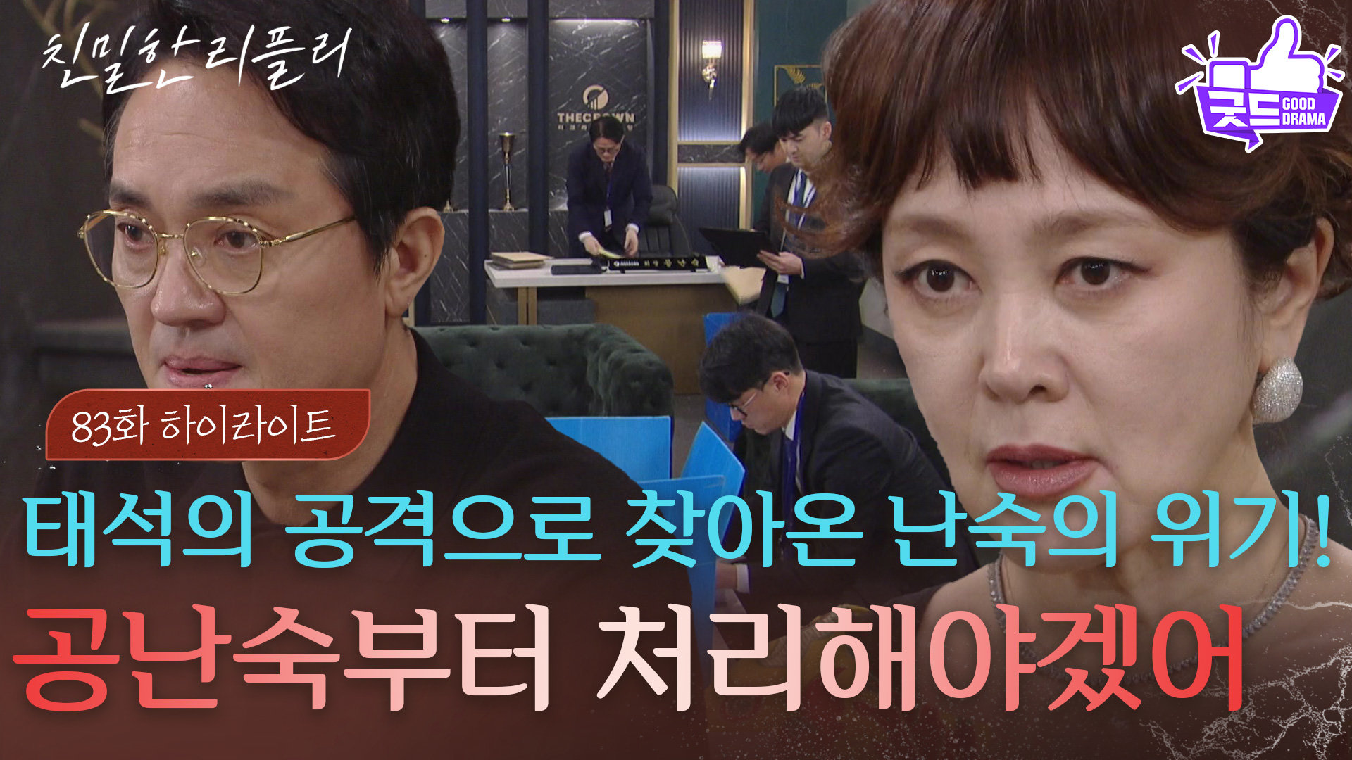 재생 0회 | 등록 2026.01.23[83회 하이라이트] “ 세무조사?! ” 최종환의 계획으로 위기에 몰린 이승연! #굿드 Copyright ⓒ KBS. All…