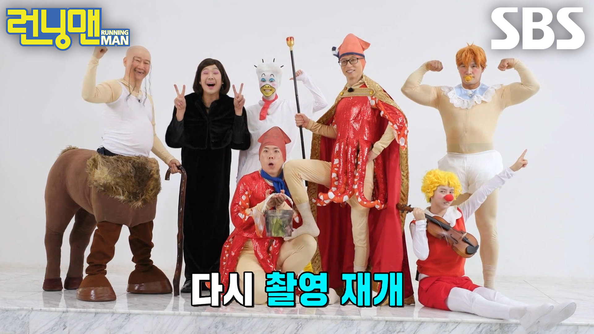런닝맨 멤버들은 캐릭터 분장을 하고 단체 포스터 촬영을 한다. 예 능 | 런닝맨 789회 본방송 | 2월 8일 일요일 밤 6시 10분 Copyright ⓒ SBS. All rights reserved. 무단 전재, 재배포 및 AI학습 이용 금지